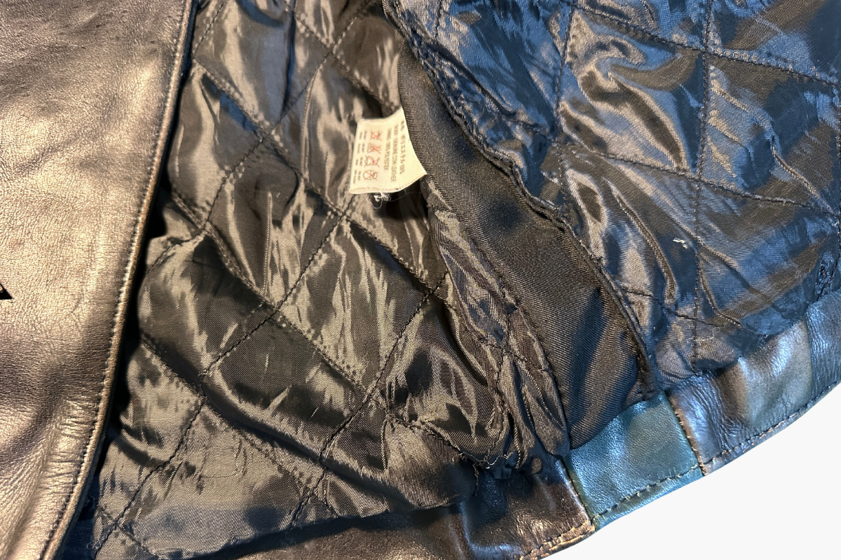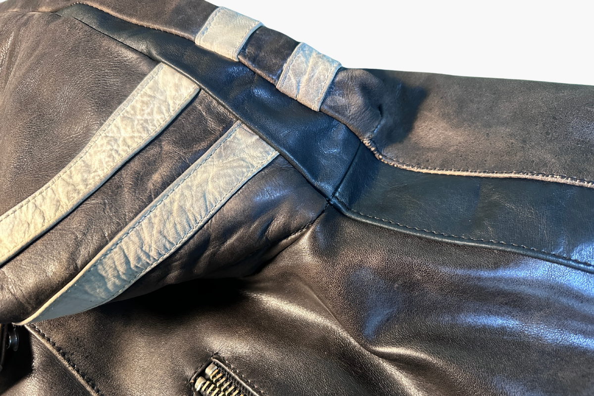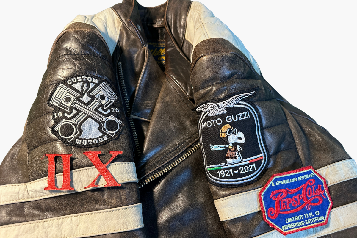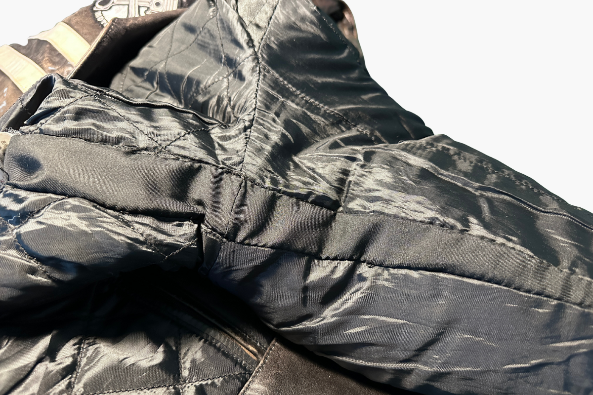 レザージャケットの身幅がきつく、前を閉めると圧迫感があるということで、サイズアップのご依頼をいただきました。さらに今回は、お客様よりご指定いただいたワッペンへの付け替えも同時に行っています。