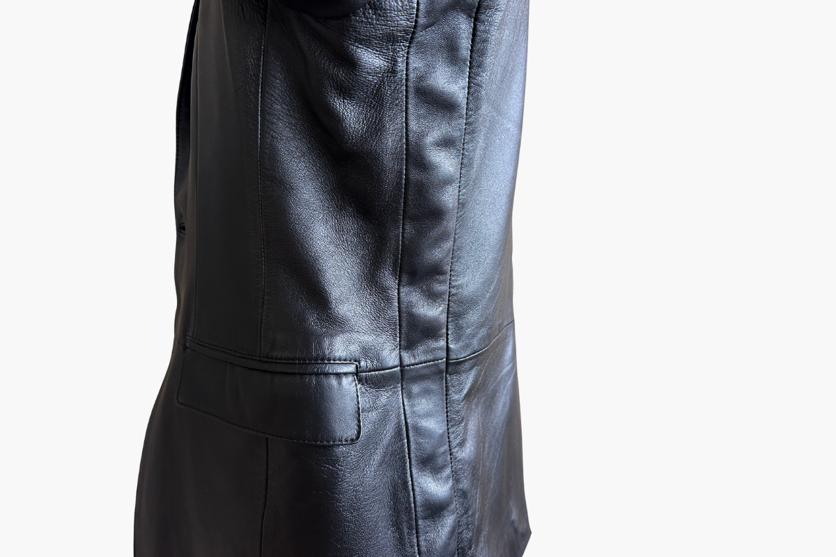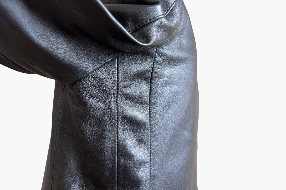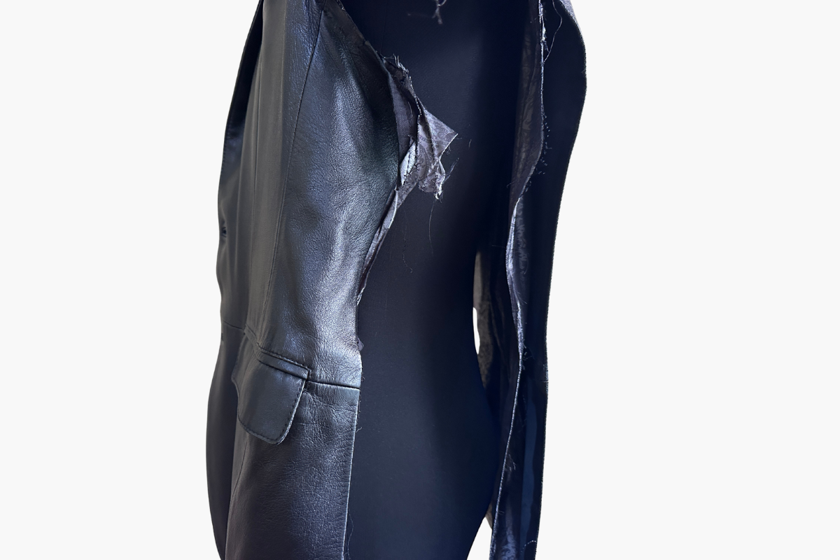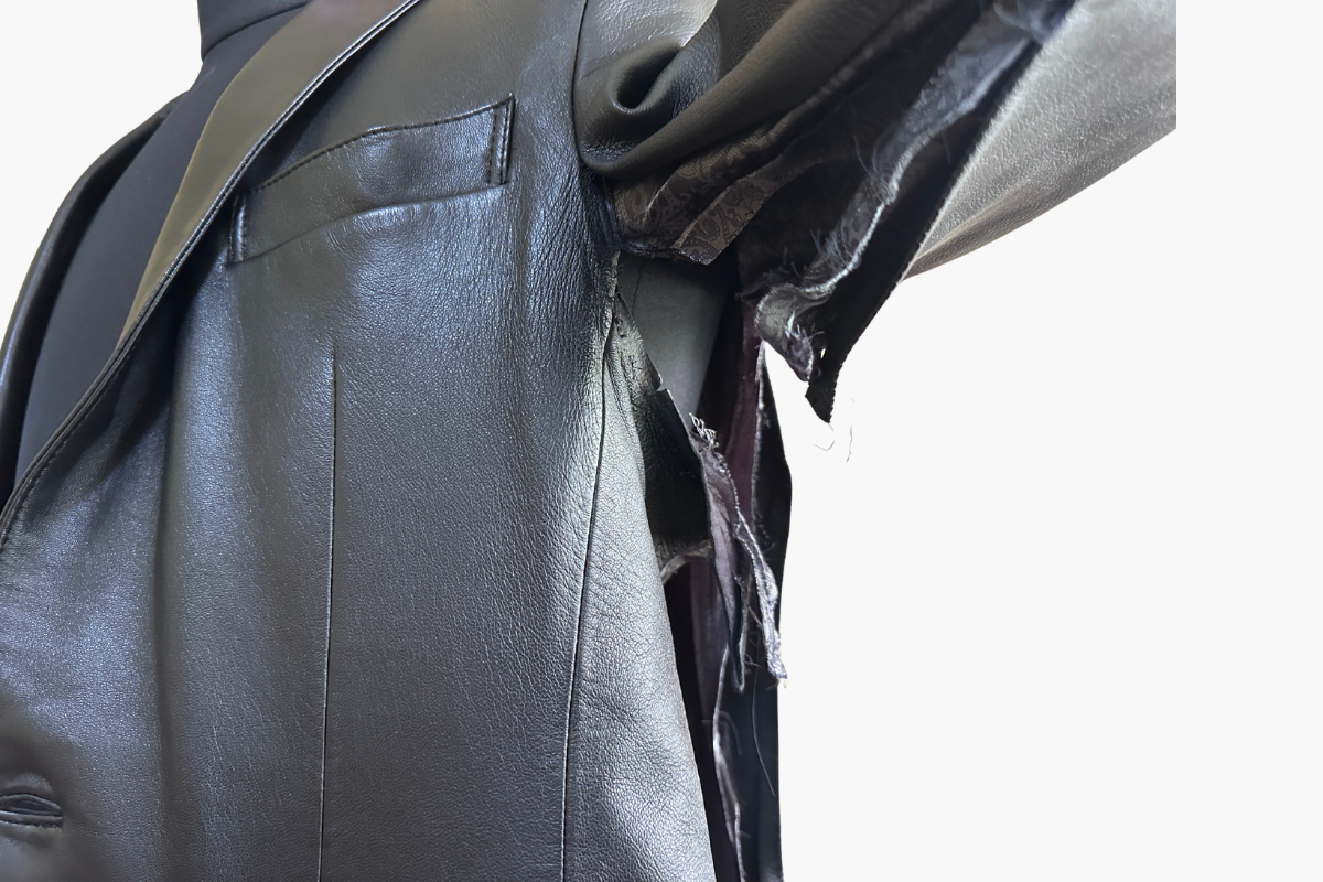 レザージャケットの着心地が窮屈で、脇まわりに圧迫感があるというご相談をいただき、身幅のサイズアップをご依頼いただきました。今回は、脇下からウエストラインにかけて革のマチを追加することで、見た目の印象を大きく変えずに、着用感の改善を図っています。作業は、革と裏地を必要な分のみ丁寧にほどくところからスタートしました。縫い糸の劣化や裂けなどは見られず、既存の構造を活かしながら調整できる状態でした。サイズアップ用には、元の革に近い質感・色味の革を新たに用意し、脇の下から自然に広がるようなマチ状のパーツとして裁断。追加部分が全体のシルエットに馴染むように設計していますが、元の革とまったく同じ素材ではないため、どうしても若干の色味や質感の差が出る仕上がりとなります。縫製後は、左右で合計約6cmの身幅アップを実現。追加パーツを組み込んだことで、身幅や袖幅に加えてアームホールまわりにもゆとりが生まれ、全体的に動きやすく快適な着心地へと改善されました。また、裏地についてもサイズアップに合わせて延長・再構成を行い、着心地に直結する部分も丁寧に対応しています。革ジャケットのサイズ調整は、単に広げるだけでなく、全体のバランスや縫製強度、素材の相性など多くの要素を踏まえて進める必要があります。今回は、着心地の向上を第一にしつつ、デザイン全体に違和感が出ないよう細部まで配慮しながら仕上げました。「サイズが合わなくなった」「もう少し余裕が欲しい」と感じることがあれば、ぜひ一度ご相談ください。理想の着心地に近づけるために、状態やご要望に合わせた最適なご提案をさせていただきます。