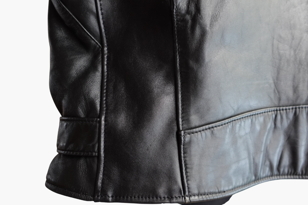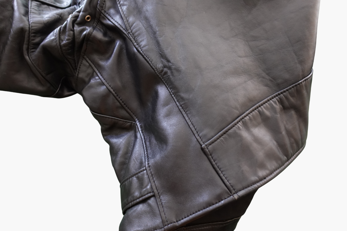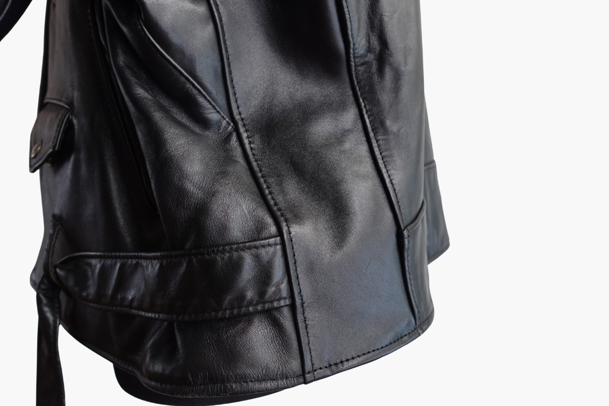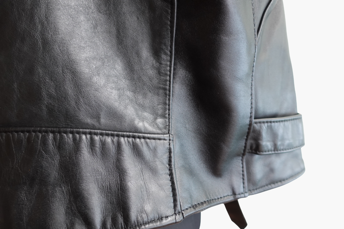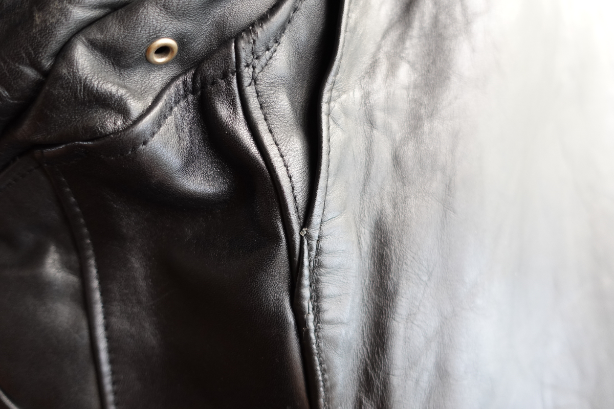 after画像(3枚目以降)では、脇線に沿って自然にマチ革を挿入し、肩から裾にかけてのラインを滑らかに再構成しています。マチ部分にはオリジナルに近い艶感と厚みを持つブラックステアを採用。既存パネルとの色差や質感の違和感を最小限に抑えながら、しっかりとした可動性を確保しました。ステッチはオリジナルのピッチと角度を再現し、縫い目の流れに途切れが生じないよう丁寧に仕上げています。
