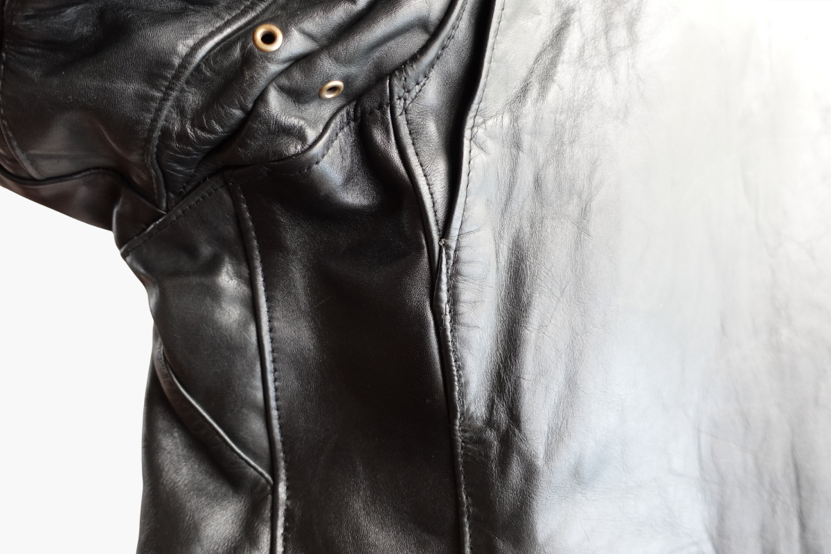 before画像(1枚目・2枚目)では、胴回りからアームホールにかけての革が強く張り、特に前傾姿勢を取る際に引きつりが見られました。この張りは613らしいシャープな印象を作る要素でもありますが、可動域を損ねやすく、縫製部への負担も大きくなります。そのため今回は、デザインを損なわない範囲でのマチ追加による拡張を選択しました。