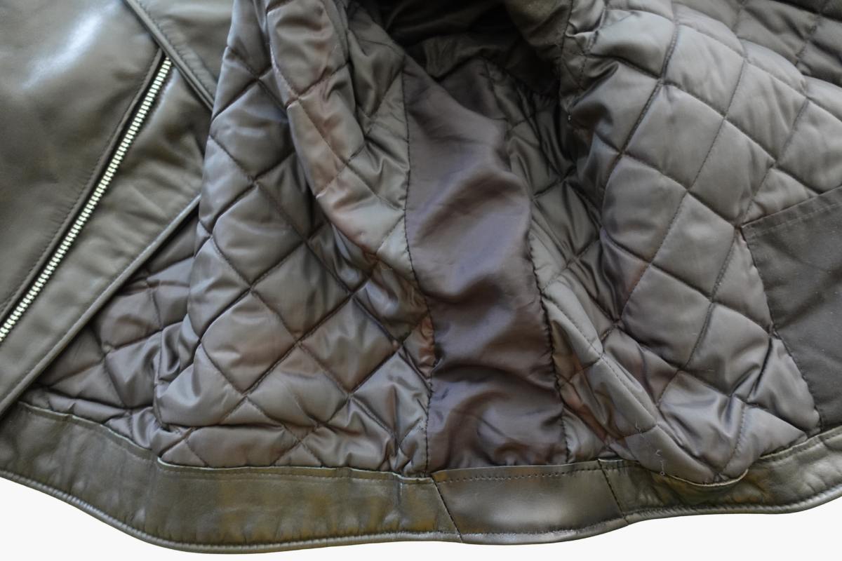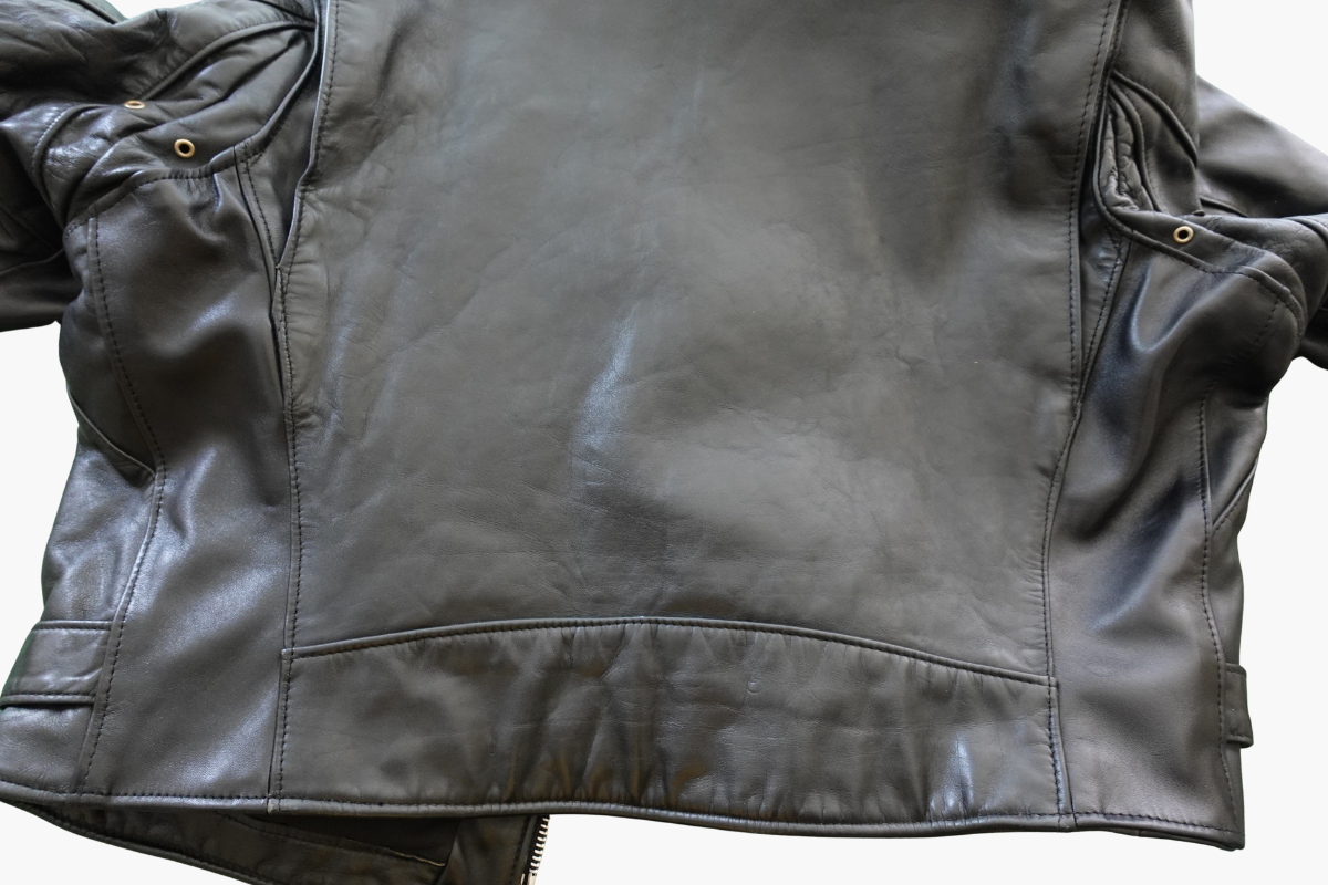 Schottの名作「613」ダブルライダース。硬質なステアハイド特有の張りとタイトな設計が魅力ですが、今回はライディング時の動きに対応できるよう、左右10cmずつ(計20cm)身幅を拡張しています。